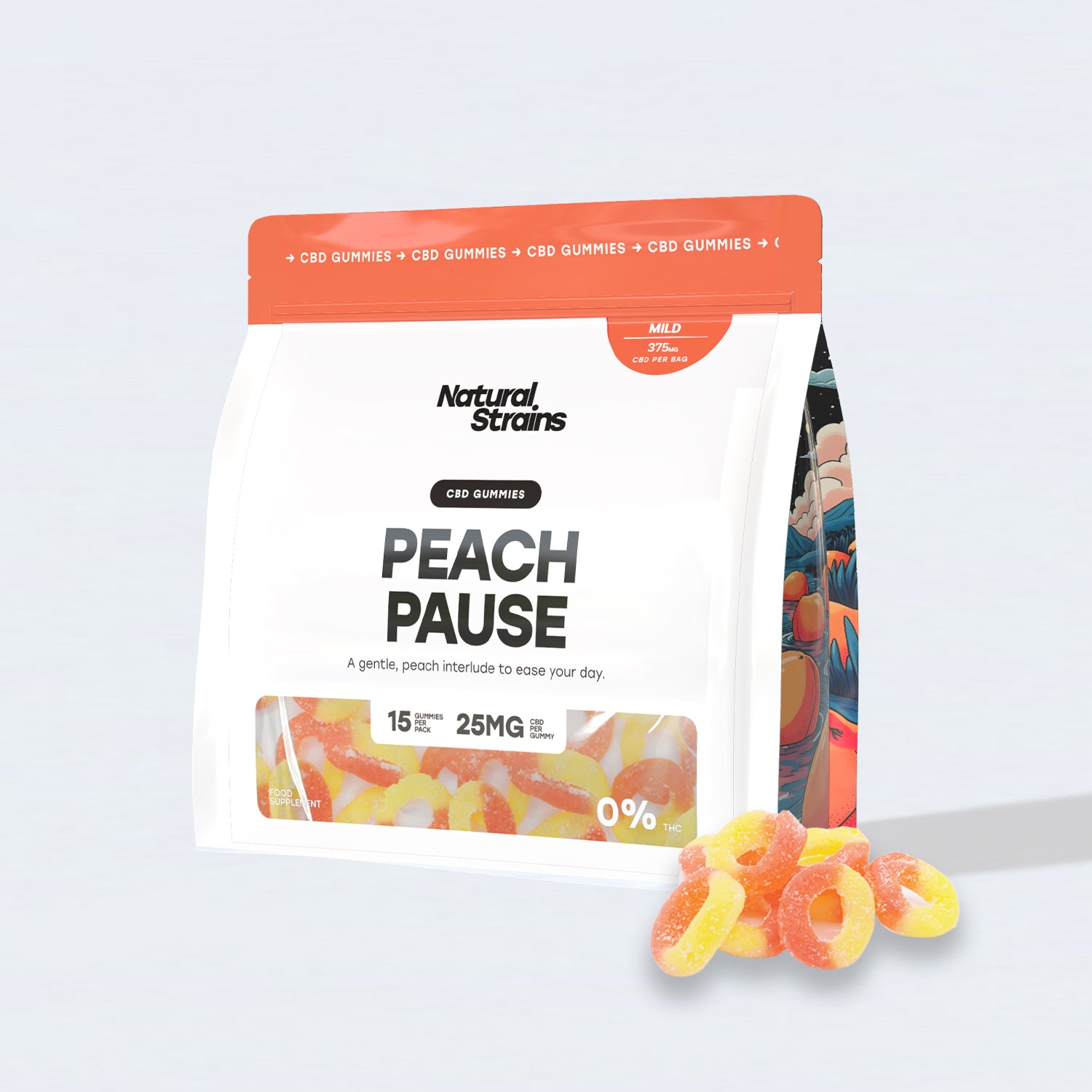 This pouch contains 15 peach-flavoured gummies, each infused with 25mg of broad spectrum CBD (375mg total).