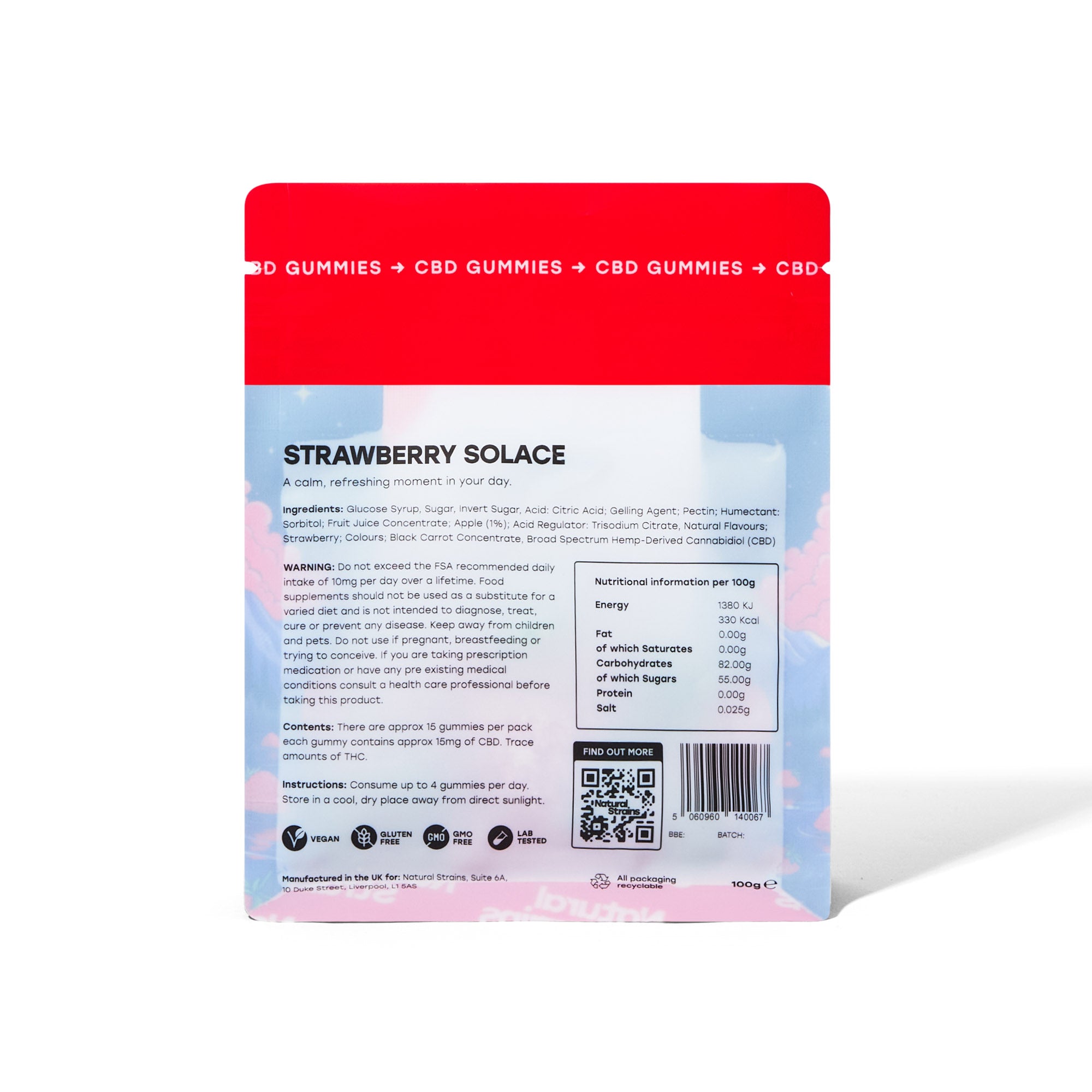 This pouch contains 15 strawberry-flavoured gummies, each infused with 15mg of broad spectrum CBD (225mg total).