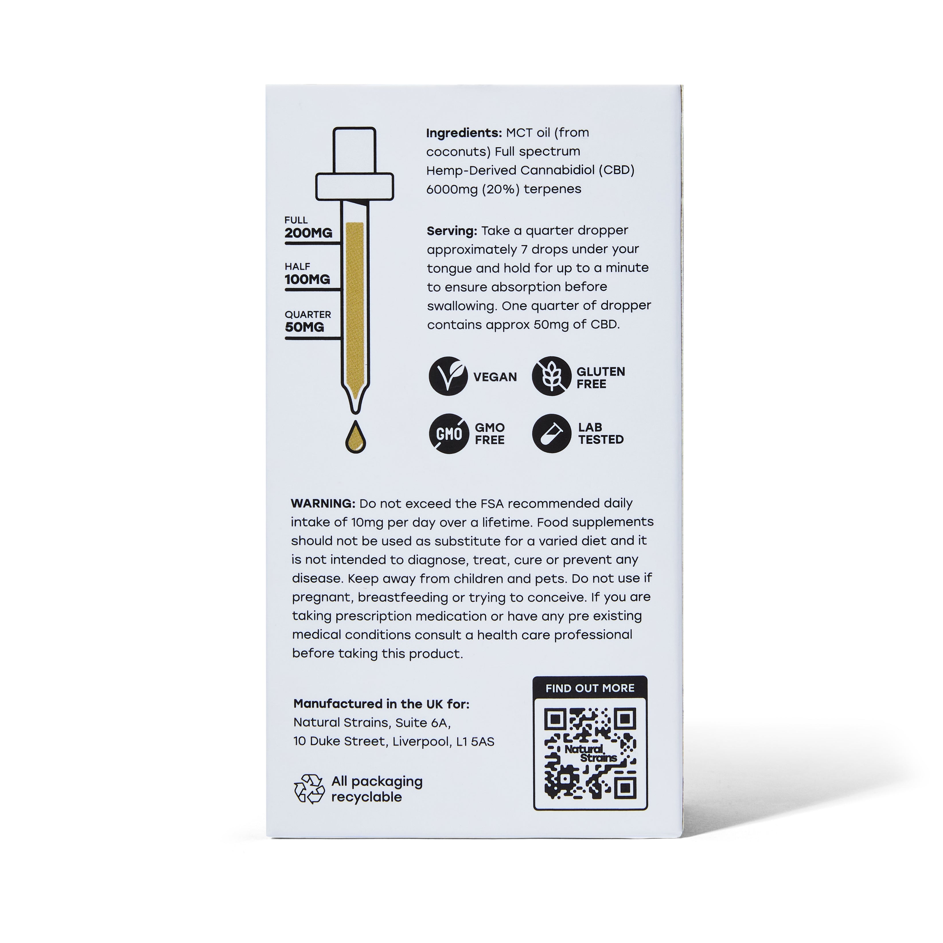 Place one full dropper (around 20 drops) under the tongue and hold for up to 60 seconds before swallowing. Each full dropper provides approximately 200mg of CBD.